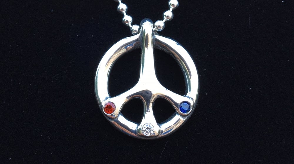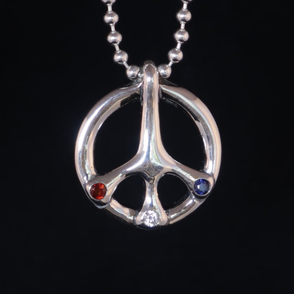 David has created his own interpretation of the iconic peace sign with a fluid line that suggests a peaceful airplane crossing the globe. For 2023, he's studded it with 2mm faceted gems in red (garnet), white (cubic zirconia) and blue (sapphire) to add a dash of patriotism. This simple pendant can be worn by a man or a woman and will attract attention not only for it’s classic design but also for its timeless message.